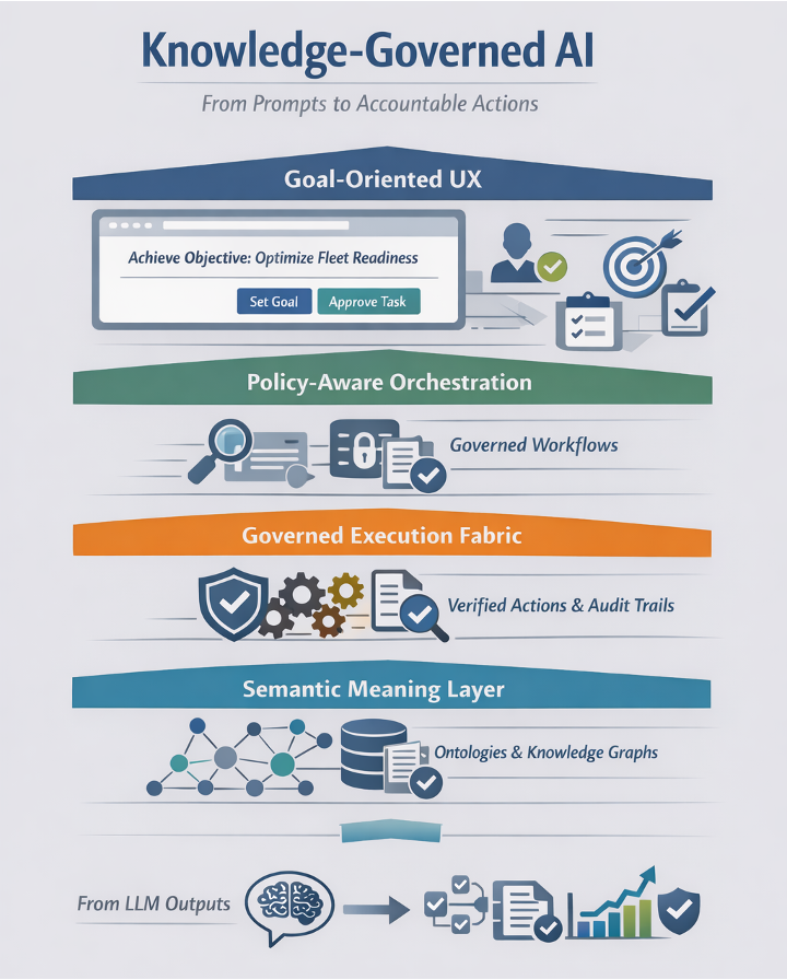This post argues that the next evolution of enterprise AI is not “more prompts” but an engineered architecture: a semantic meaning layer, policy-aware orchestration, and a governed execution fabric that turns model outputs into accountable actions. When those layers exist, the user experience naturally rises from transactions to goal-oriented execution (GoUX).